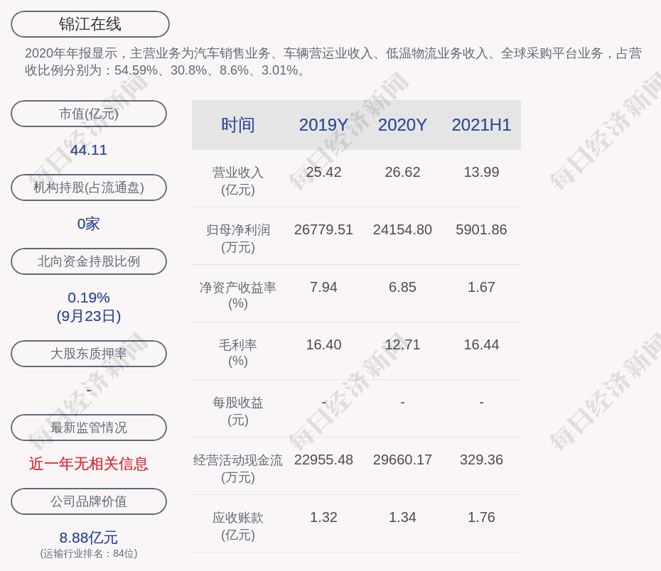 2020年年报显示,锦江在线的主营业务为汽车销售业务、车辆营运业收入、低温物流业务收入、全球采购平台业务,占营收比例分别为:54.59%、30.8%、8.6%、3.01%。
