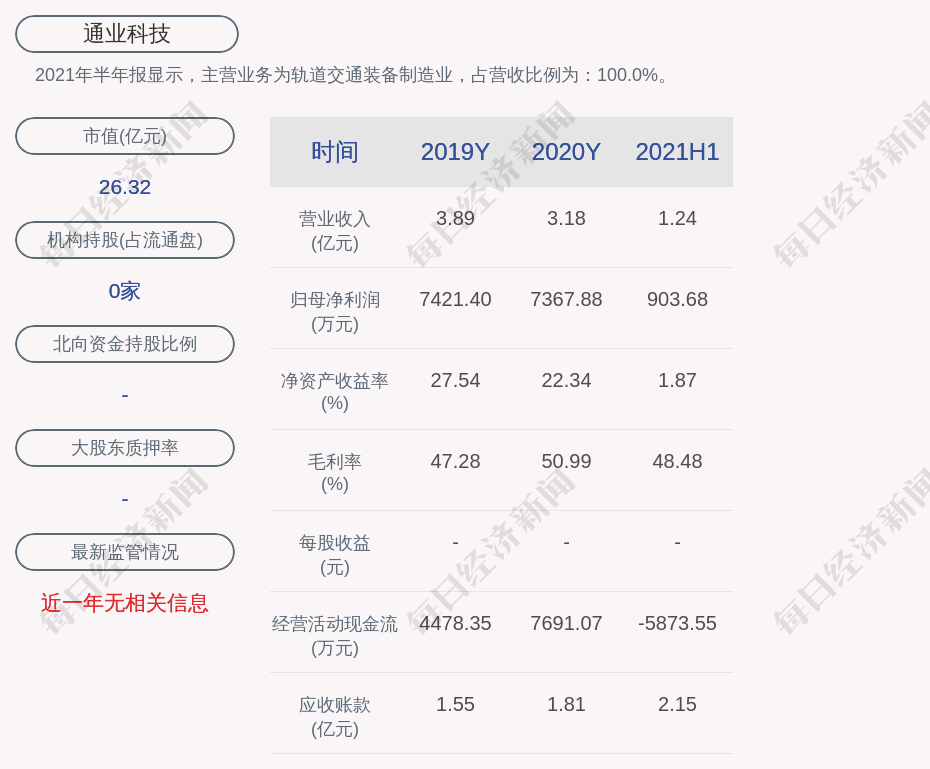 2021年半年报显示,通业科技的主营业务为轨道交通装备制造业,占营收比例为:100.0%。