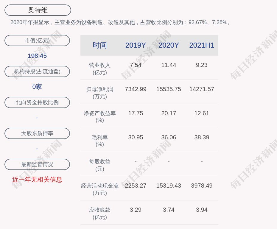2020年年报显示,奥特维的主营业务为设备制造、改造及其他,占营收比例分别为:92.67%、7.28%。