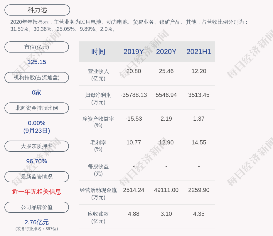 2020年年报显示,科力远的主营业务为民用电池、动力电池、贸易业务、镍矿产品、其他,占营收比例分别为:31.51%、30.38%、25.05%、9.89%、2.0%。