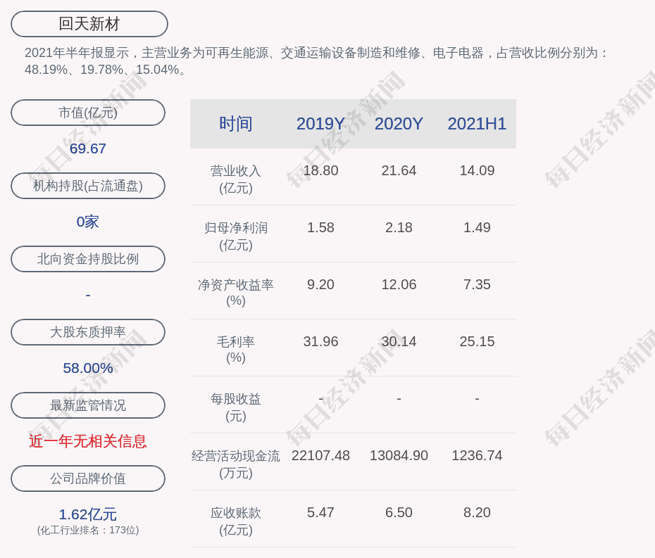 2021年半年报显示,回天新材的主营业务为可再生能源、交通运输设备制造和维修、电子电器,占营收比例分别为:48.19%、19.78%、15.04%。