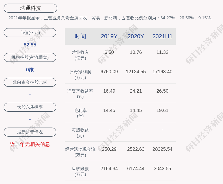 2021年年报显示,浩通科技的主营业务为贵金属回收、贸易、新材料,占营收比例分别为:64.27%、26.56%、9.15%。