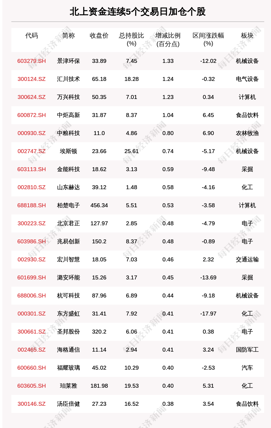 每经AI快讯,9月24日,北上资金连续5个交易日买入45个股。北上资金连续5个交易日加仓个股中,景津环保(603279.SH,收盘价:33.89元)增持比例增幅最大,5个交易日增持1.33个百分点,其他增持比例较大的个股包括汇川技术(300124.SZ,收盘价:65.18元)、万兴科技(300624.SZ,收盘价:50.35元)、中炬高新(600872.SH,收盘价:31.87元),分别增持1.24个百分点、1.23个百分点、1.04个百分点。
