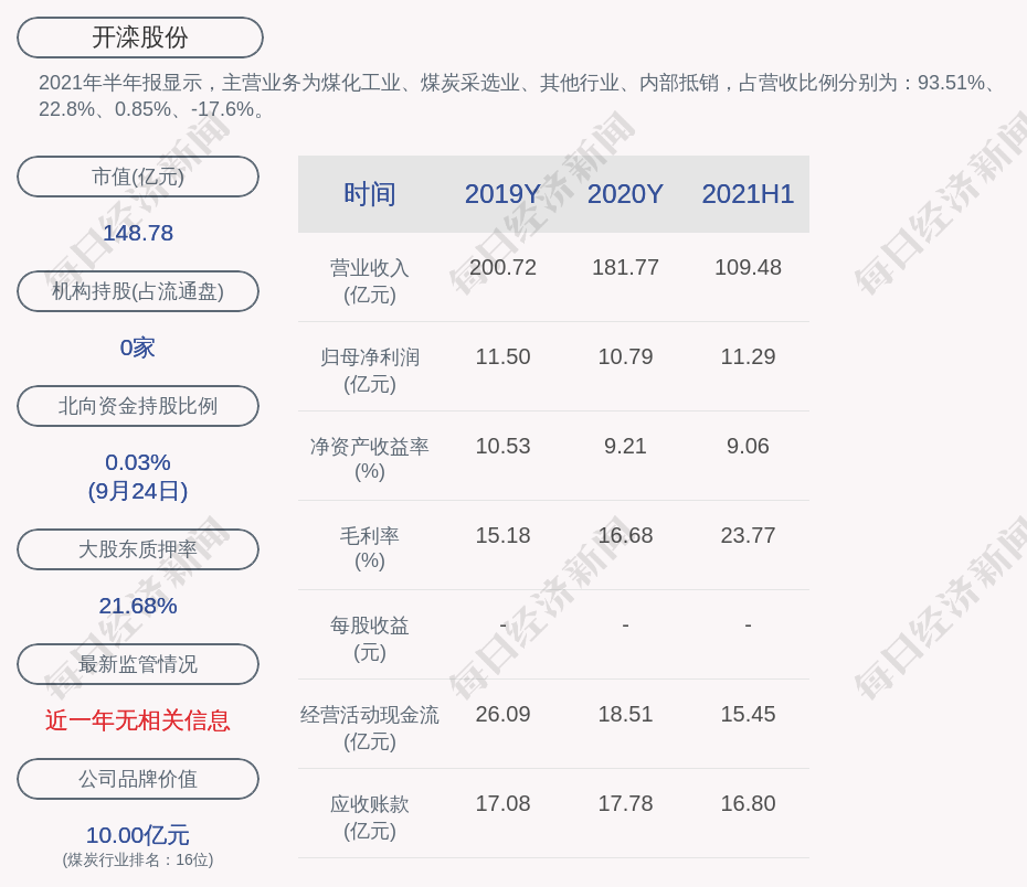 2021年半年报显示,开滦股份的主营业务为煤化工业、煤炭采选业、其他行业、内部抵销,占营收比例分别为:93.51%、22.8%、0.85%、-17.6%。