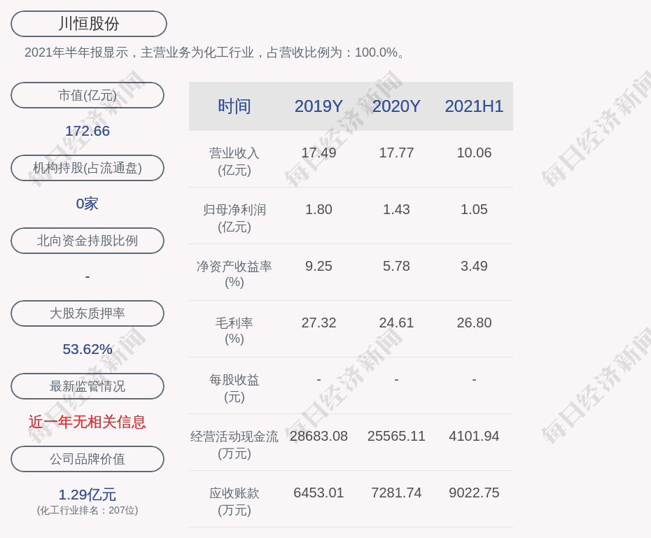 2021年半年报显示,川恒股份的主营业务为化工行业,占营收比例为:100.0%。