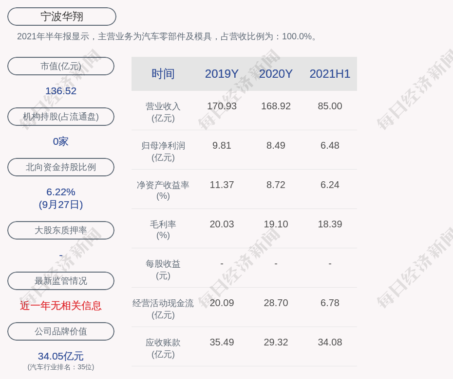 2021年半年报显示,宁波华翔的主营业务为汽车零部件及模具,占营收比例为:100.0%。