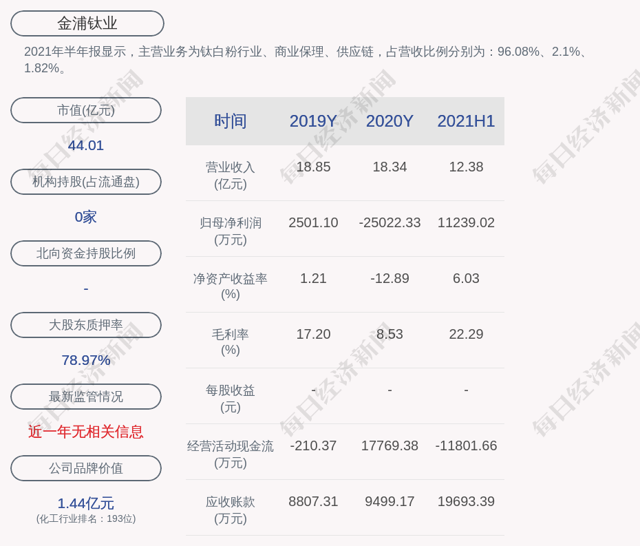 2021年半年报显示,金浦钛业的主营业务为钛白粉行业、商业保理、供应链,占营收比例分别为:96.08%、2.1%、1.82%。