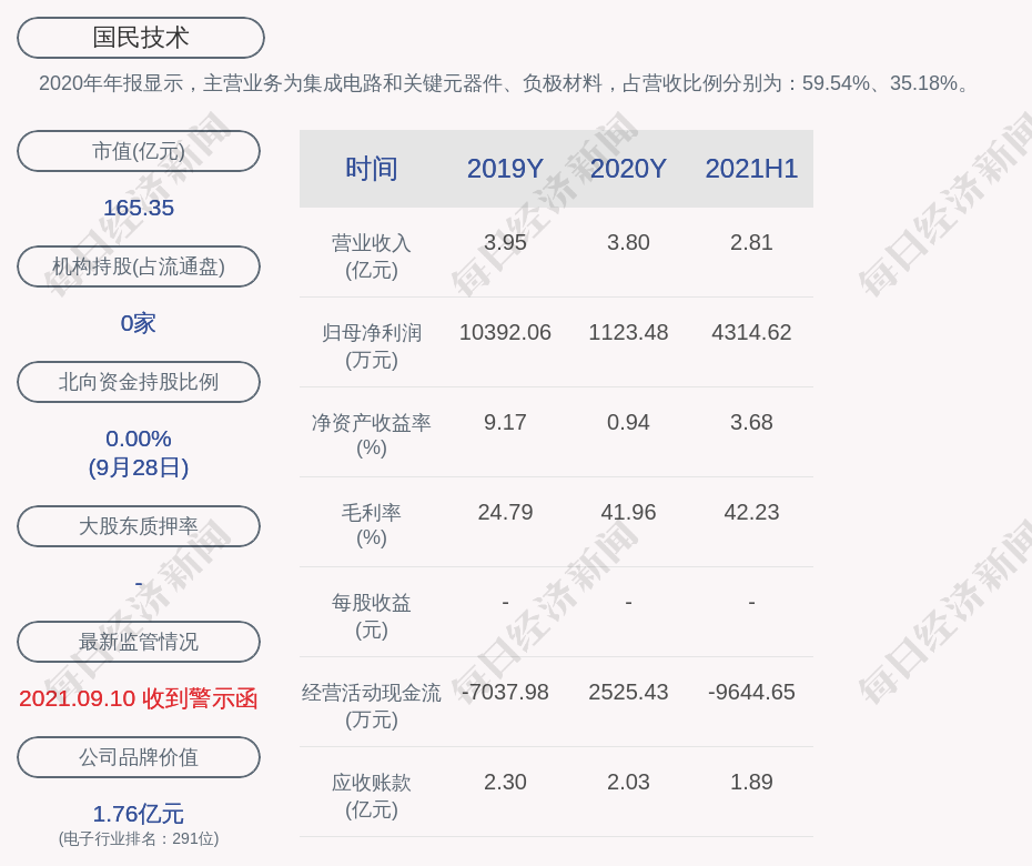 2020年年报显示,国民技术的主营业务为集成电路和关键元器件、负极材料,占营收比例分别为:59.54%、35.18%。