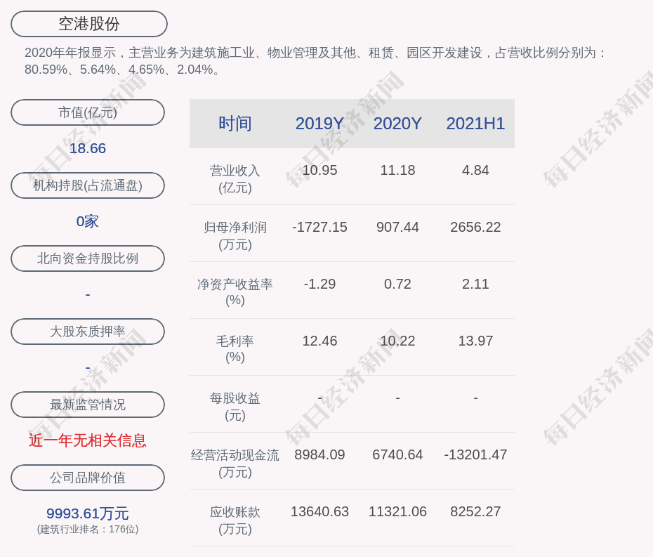 2020年年报显示,空港股份的主营业务为建筑施工业、物业管理及其他、租赁、园区开发建设,占营收比例分别为:80.59%、5.64%、4.65%、2.04%。