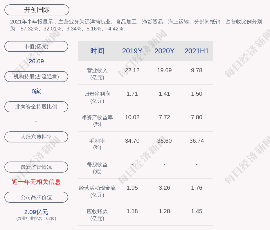 2021年半年报显示,开创国际的主营业务为远洋捕捞业、食品加工、渔货贸易、海上运输、分部间抵销,占营收比例分别为:57.32%、32.01%、9.34%、5.16%、-4.42%。