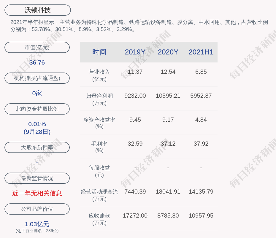 2021年半年报显示,沃顿科技的主营业务为特殊化学品制造、铁路运输设备制造、膜分离、中水回用、其他,占营收比例分别为:53.78%、30.51%、8.9%、3.52%、3.29%。