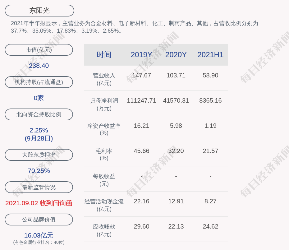 2021年半年报显示,东阳光的主营业务为合金材料、电子新材料、化工、制药产品、其他,占营收比例分别为:37.7%、35.05%、17.83%、3.19%、2.65%。