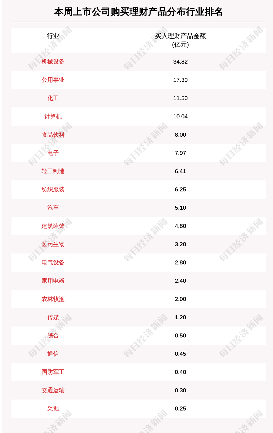 从上市公司所属行业上来看,本周买入理财产品金额排名前三的行业分别是机械设备、公用事业、化工。