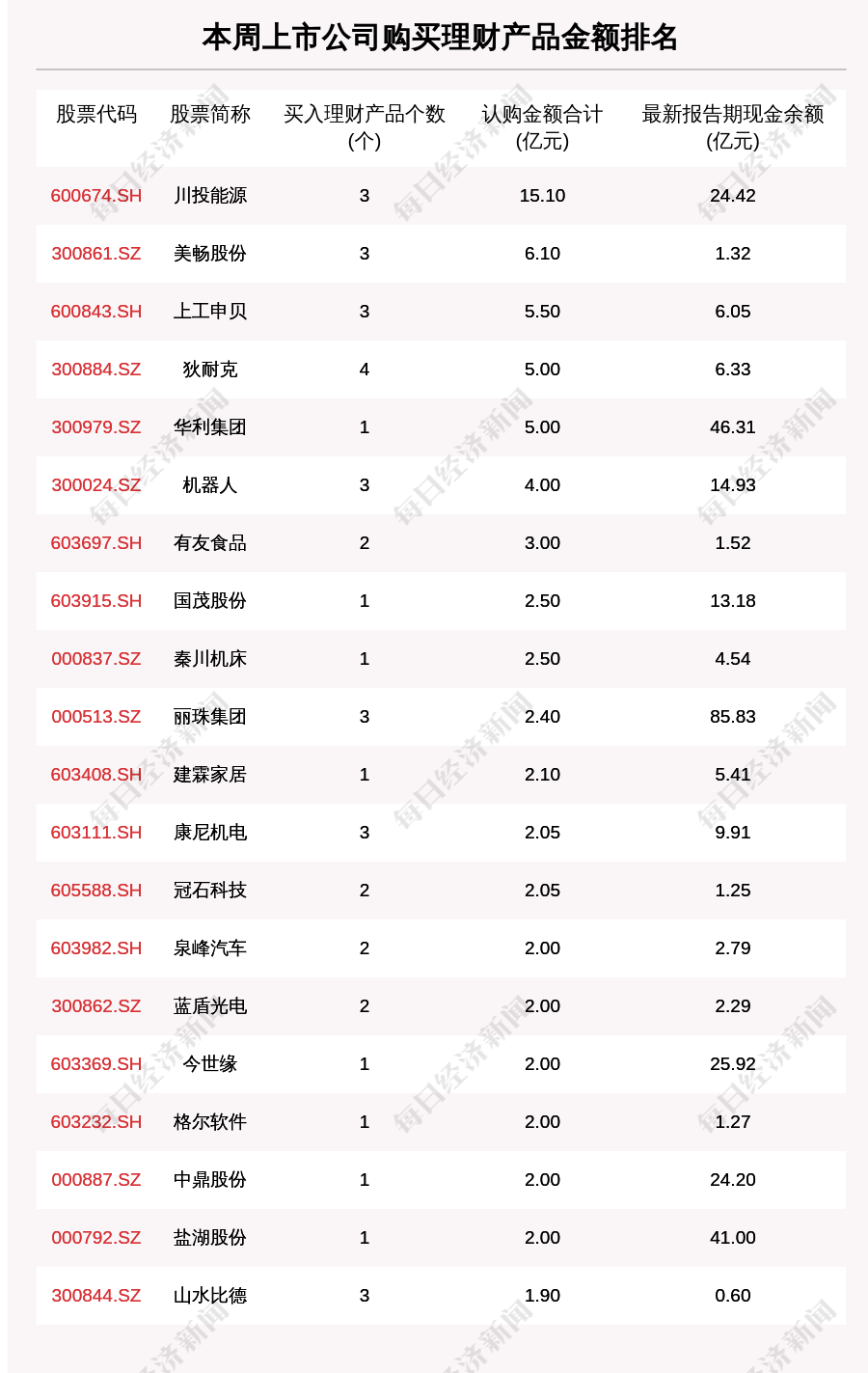 每经AI快讯,本周A股共98家公司购买理财产品125.96亿元,金额环比上周减少1.84%。