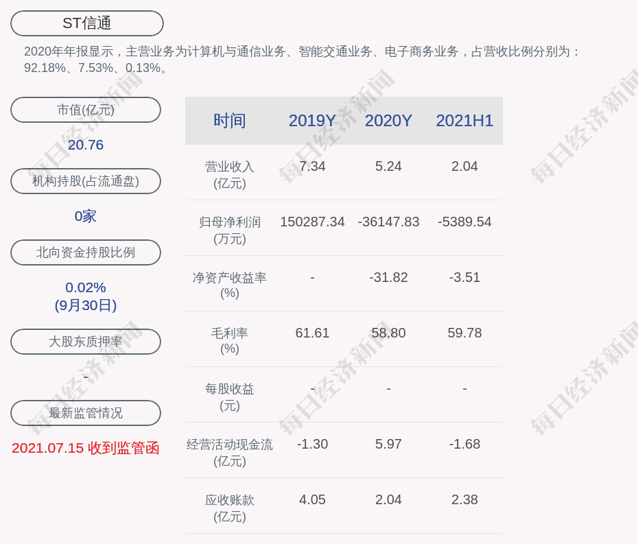 2020年年报显示,ST信通的主营业务为计算机与通信业务、智能交通业务、电子商务业务,占营收比例分别为:92.18%、7.53%、0.13%。