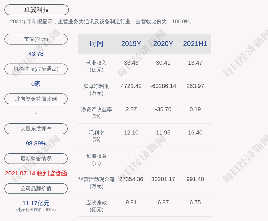 2021年半年报显示,卓翼科技的主营业务为通讯及设备制造行业,占营收比例为:100.0%。