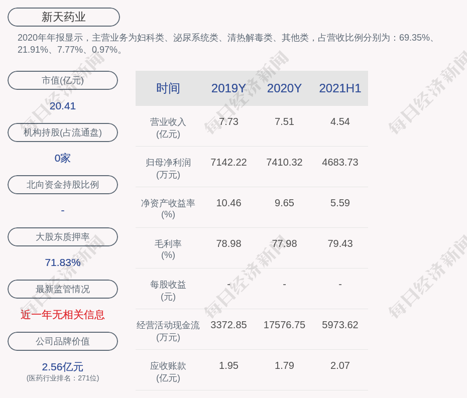 2020年年报显示,新天药业的主营业务为妇科类、泌尿系统类、清热解毒类、其他类,占营收比例分别为:69.35%、21.91%、7.77%、0.97%。