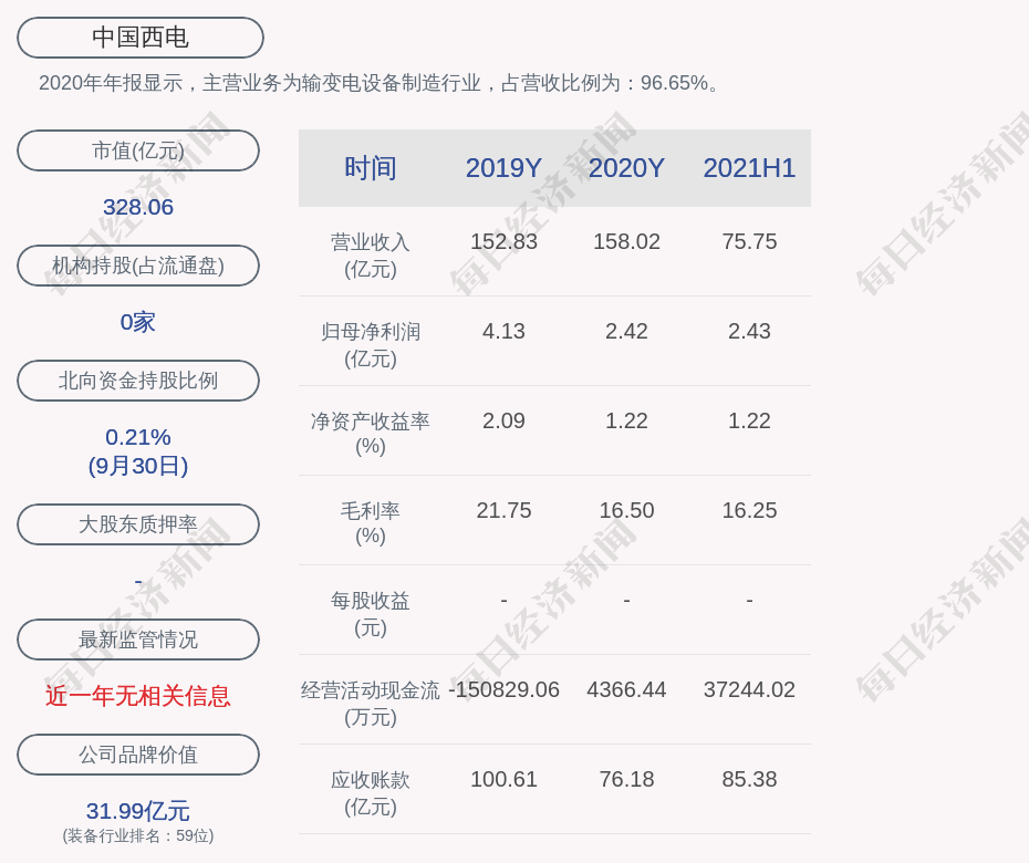 2020年年报显示,中国西电的主营业务为输变电设备制造行业,占营收比例为:96.65%。