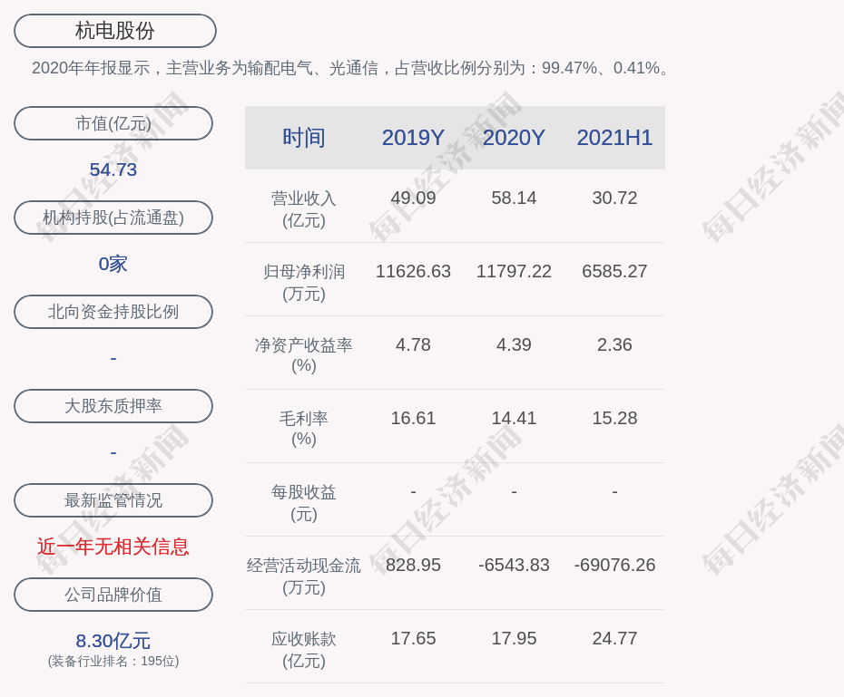 2020年年报显示,杭电股份的主营业务为输配电气、光通信,占营收比例分别为:99.47%、0.41%。