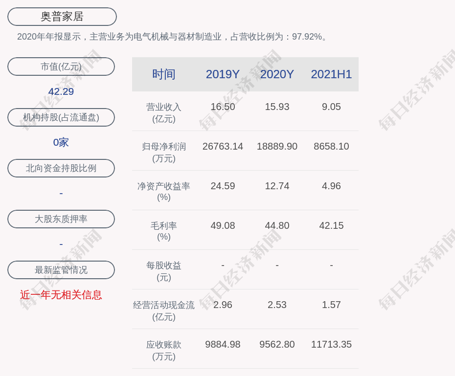 2020年年报显示,奥普家居的主营业务为电气机械与器材制造业,占营收比例为:97.92%。