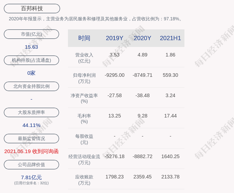 2020年年报显示,百邦科技的主营业务为居民服务和修理及其他服务业,占营收比例为:97.18%。