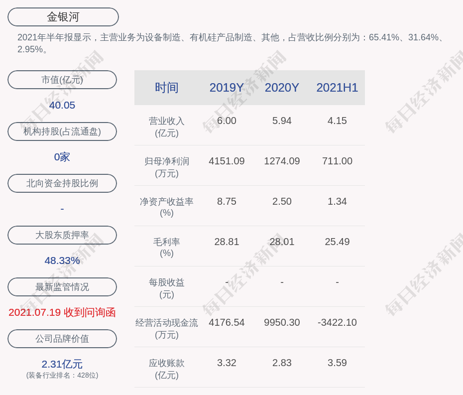 2021年半年报显示,金银河的主营业务为设备制造、有机硅产品制造、其他,占营收比例分别为:65.41%、31.64%、2.95%。