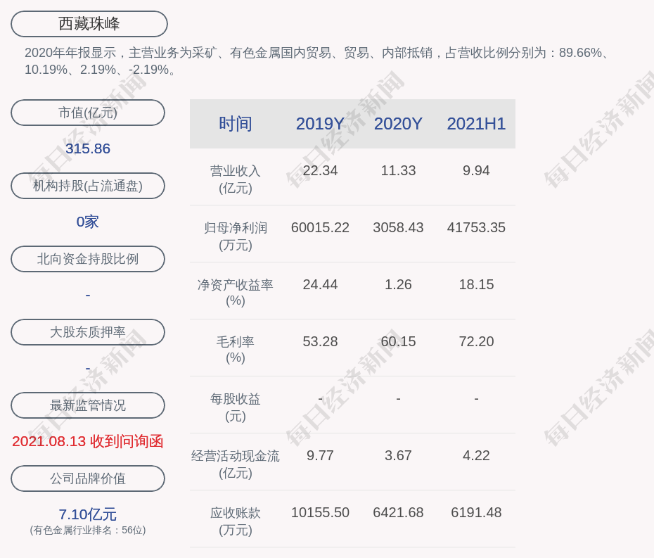 2020年年报显示,西藏珠峰的主营业务为采矿、有色金属国内贸易、贸易、内部抵销,占营收比例分别为:89.66%、10.19%、2.19%、-2.19%。