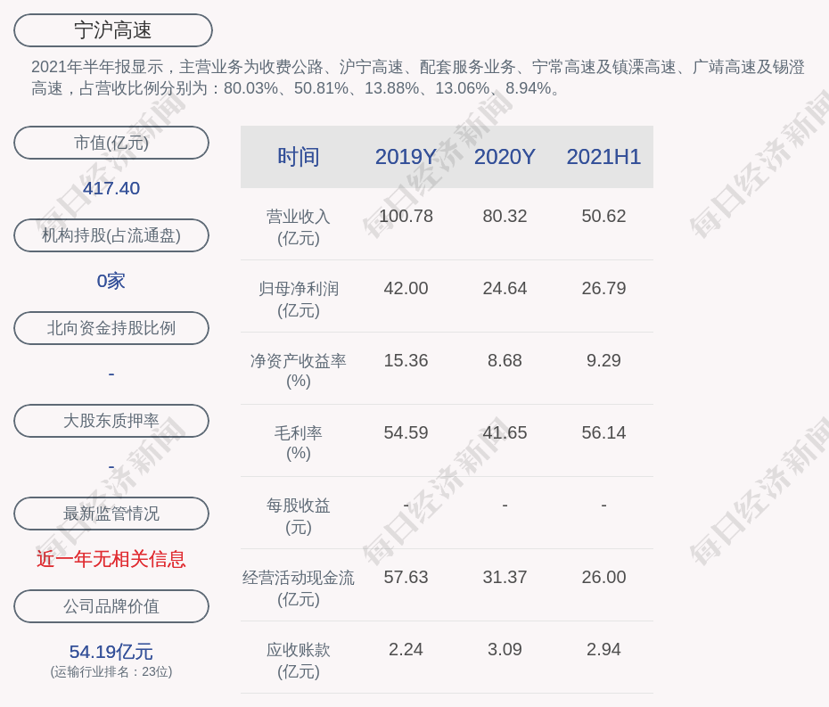 2021年半年报显示,宁沪高速的主营业务为收费公路、沪宁高速、配套服务业务、宁常高速及镇溧高速、广靖高速及锡澄高速,占营收比例分别为:80.03%、50.81%、13.88%、13.06%、8.94%。