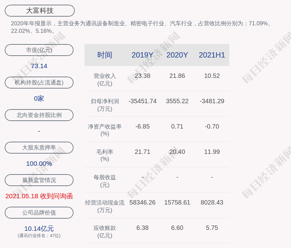 2020年年报显示,大富科技的主营业务为通讯设备制造业、精密电子行业、汽车行业,占营收比例分别为:71.09%、22.02%、5.16%。