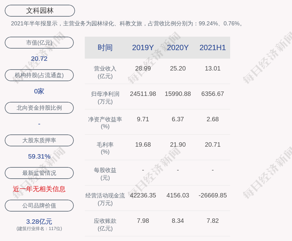 2021年半年报显示,文科园林的主营业务为园林绿化、科教文旅,占营收比例分别为:99.24%、0.76%。