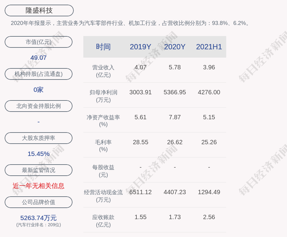 2020年年报显示,隆盛科技的主营业务为汽车零部件行业、机加工行业,占营收比例分别为:93.8%、6.2%。