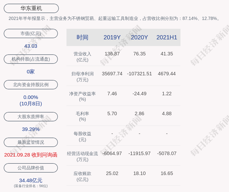2021年半年报显示,华东重机的主营业务为不锈钢贸易、起重运输工具制造业,占营收比例分别为:87.14%、12.78%。