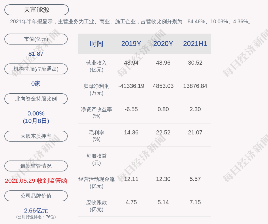 2021年半年报显示,天富能源的主营业务为工业、商业、施工企业,占营收比例分别为:84.46%、10.08%、4.36%。
