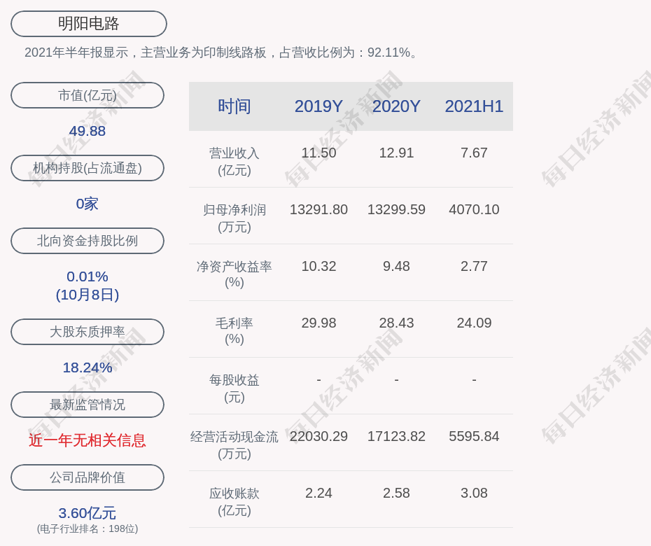 2021年半年报显示,明阳电路的主营业务为印制线路板,占营收比例为:92.11%。