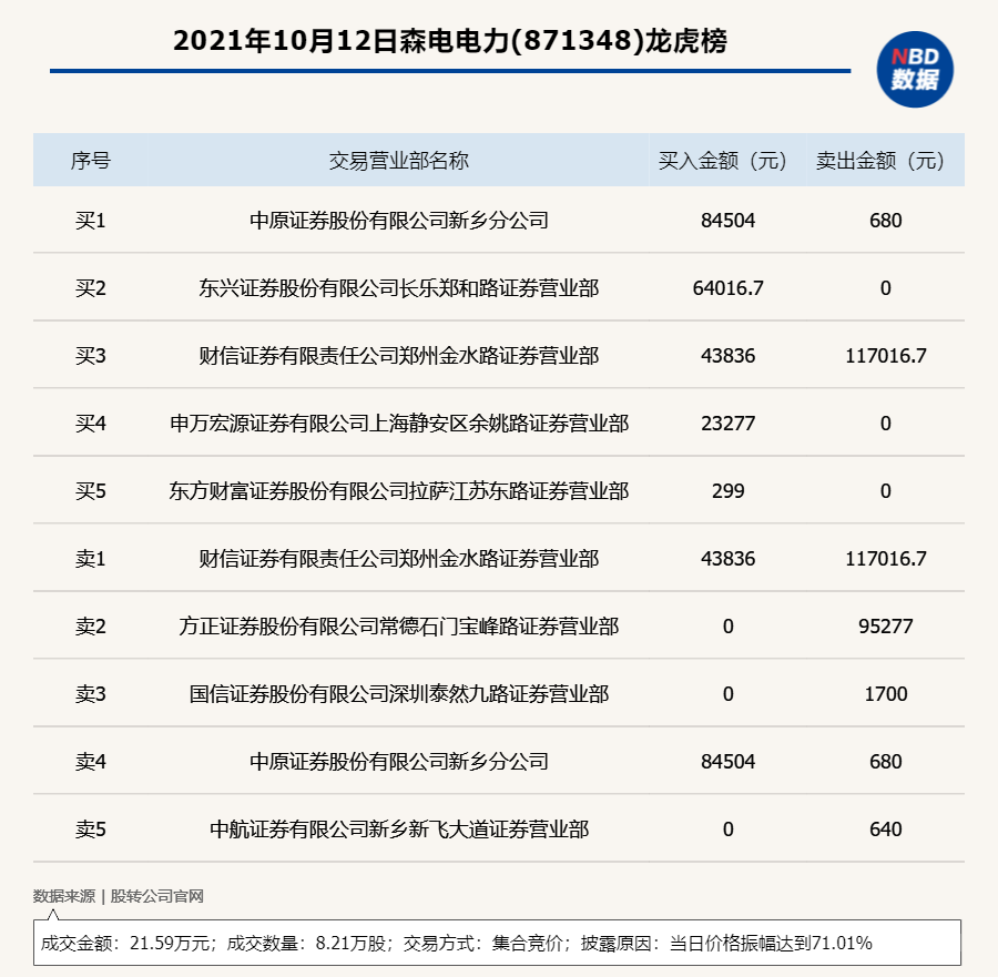 2021年10月12日,森电电力(871348)登上龙虎榜,交易方式是集合竞价,披露原因是当日价格振幅达到71.01%,成交数量8.21万股,成交金额21.59万元。买一席位为中原证券股份有限公司新乡分公司,买入8.45万元;卖一席位为财信证券有限责任公司郑州金水路证券营业部,卖出11.70万元。