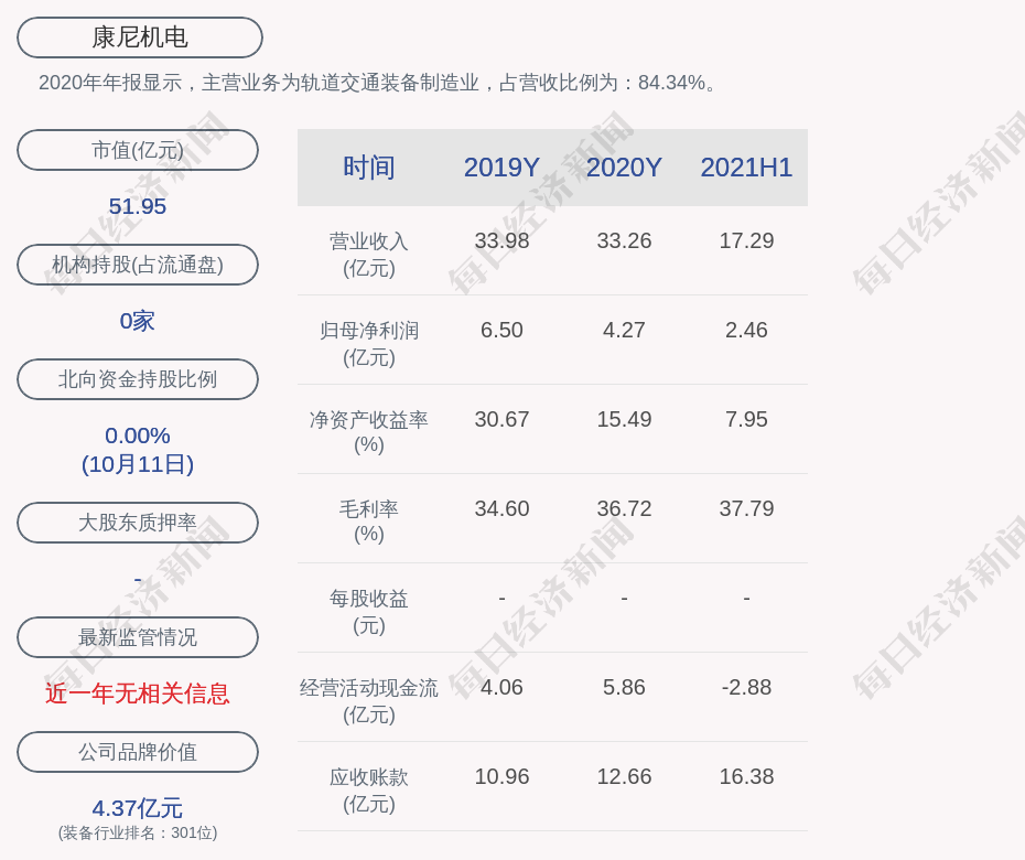 2020年年报显示,康尼机电的主营业务为轨道交通装备制造业,占营收比例为:84.34%。