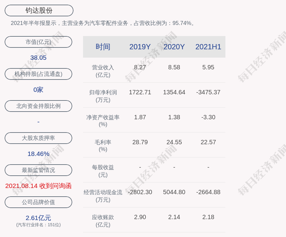 2021年半年报显示,钧达股份的主营业务为汽车零配件业务,占营收比例为:95.74%。