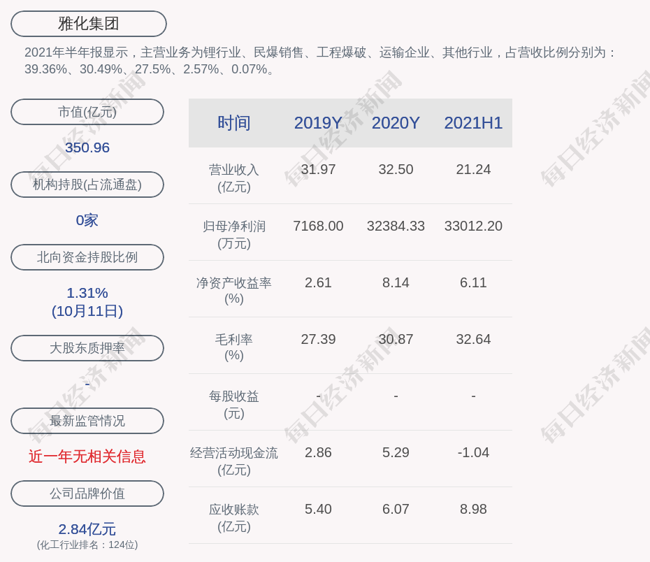 2021年半年报显示,雅化集团的主营业务为锂行业、民爆销售、工程爆破、运输企业、其他行业,占营收比例分别为:39.36%、30.49%、27.5%、2.57%、0.07%。