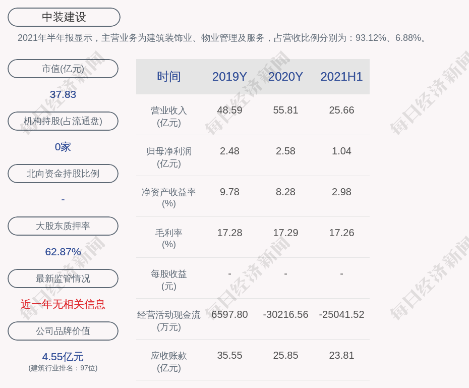 2021年半年报显示,中装建设的主营业务为建筑装饰业、物业管理及服务,占营收比例分别为:93.12%、6.88%。