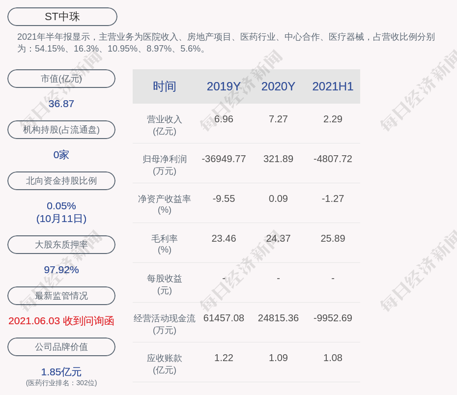 2021年半年报显示,ST中珠的主营业务为医院收入、房地产项目、医药行业、中心合作、医疗器械,占营收比例分别为:54.15%、16.3%、10.95%、8.97%、5.6%。