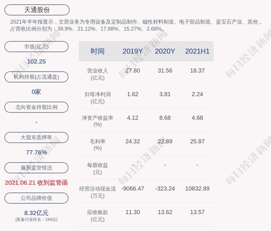 2021年半年报显示,天通股份的主营业务为专用设备及定制品制作、磁性材料制造、电子部品制造、蓝宝石产业、其他,占营收比例分别为:39.9%、21.12%、17.88%、15.27%、2.68%。