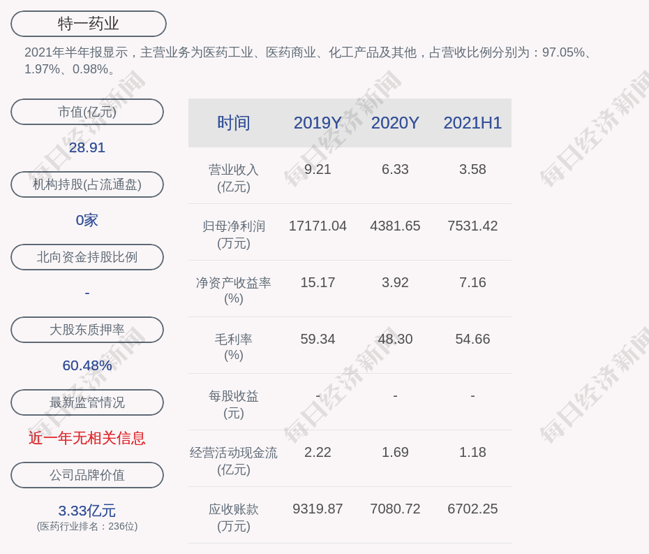 2021年半年报显示,特一药业的主营业务为医药工业、医药商业、化工产品及其他,占营收比例分别为:97.05%、1.97%、0.98%。