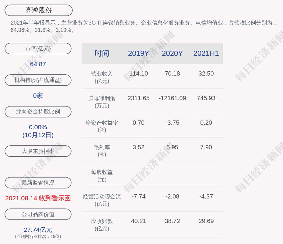 2021年半年报显示,高鸿股份的主营业务为3G-IT连锁销售业务、企业信息化服务业务、电信增值业,占营收比例分别为:64.98%、31.6%、3.19%。