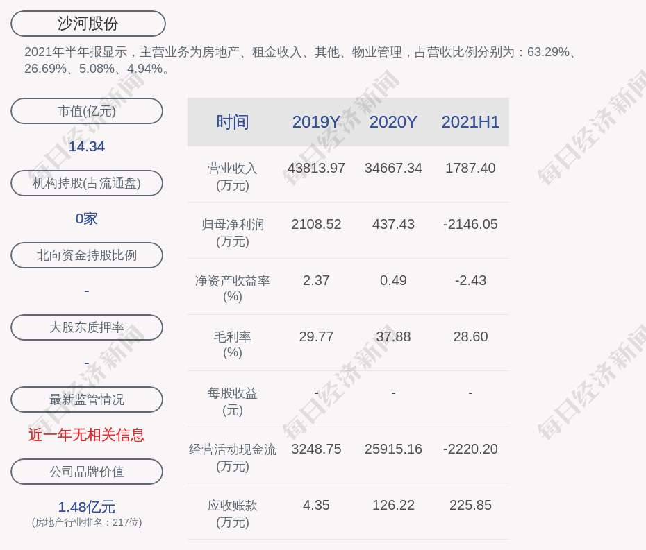2021年半年报显示,沙河股份的主营业务为房地产、租金收入、其他、物业管理。