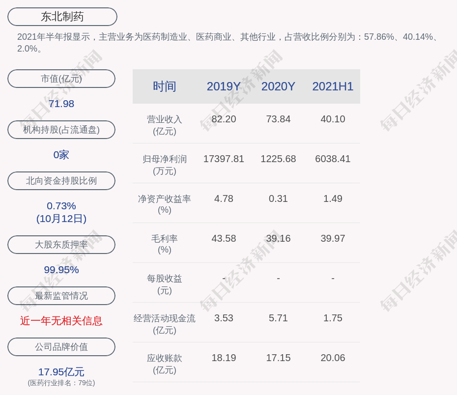2021年半年报显示,东北制药的主营业务为医药制造业、医药商业、其他行业,占营收比例分别为:57.86%、40.14%、2.0%。