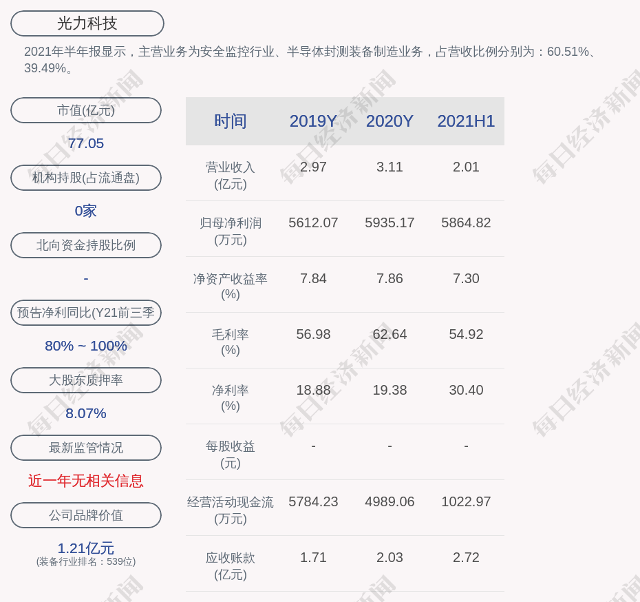 2021年半年报显示,光力科技的主营业务为安全监控行业、半导体封测装备制造业务,占营收比例分别为:60.51%、39.49%。