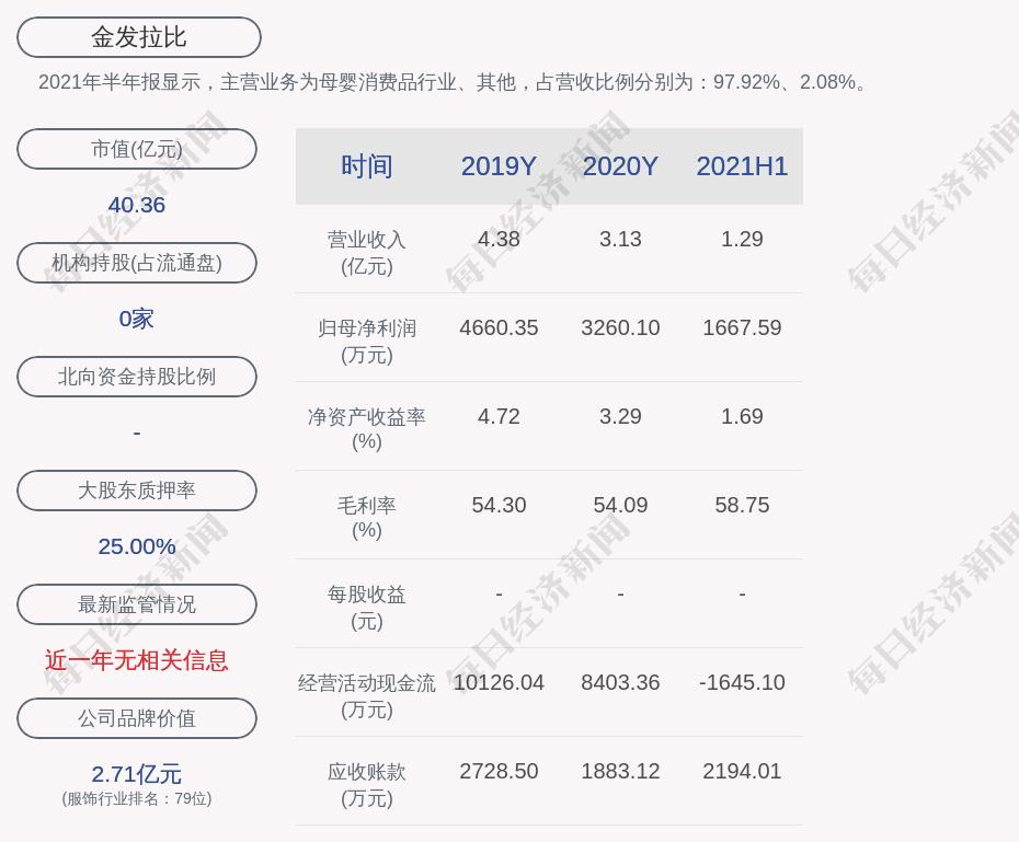 2021年半年报显示,金发拉比的主营业务为母婴消费品行业、其他,占营收比例分别为:97.92%、2.08%。