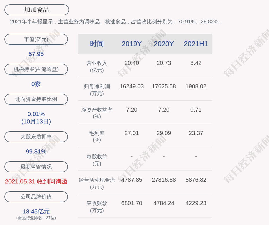 2021年半年报显示,加加食品的主营业务为调味品、粮油食品,占营收比例分别为:70.91%、28.82%。