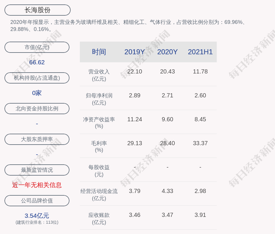 2020年年报显示,长海股份的主营业务为玻璃纤维及相关、精细化工、气体行业,占营收比例分别为:69.96%、29.88%、0.16%。