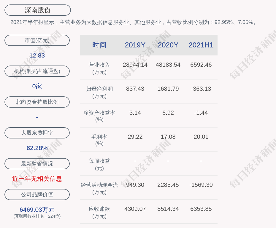 2021年半年报显示,深南股份的主营业务为大数据信息服务业、其他服务业,占营收比例分别为:92.95%、7.05%。